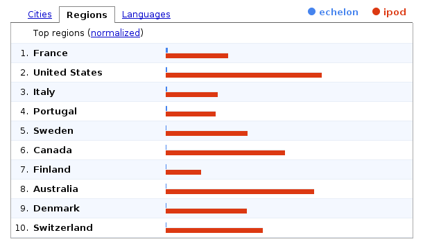 La victoria es aún más abrumadora. Además cabe destacar un dato: España no aparece porque su volumen de búsquedas acerca de Echelon no es suficiente. En Suiza -sí, ese pequeño estado centroeuropeo- generan más búsquedas sobre Echelon que en España. Sin comentarios.