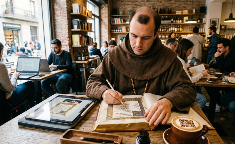 [Imagen: El monje en la cafetería, por servidor de ustedes con ayuda de Gemini.]